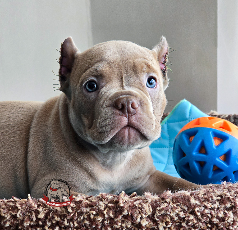Малыш Американский Булли в лиловом окрасе в типе Микро/Покет на нижней границе.
